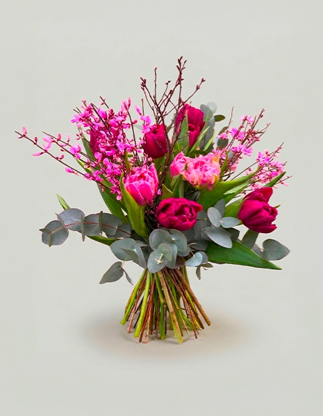 Vivace bouquet composto da tulipani e ginestra nelle sfumature del rosa e fucsia. Una composizione fresca e primaverile, perfetta per regalare colore, energia e un tocco di allegria.
