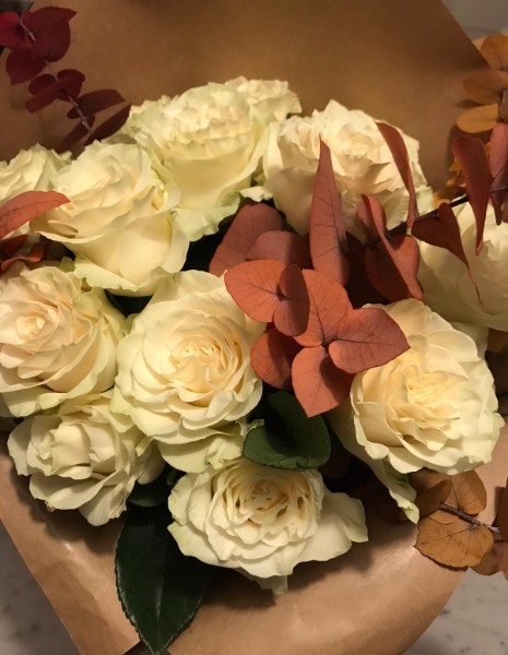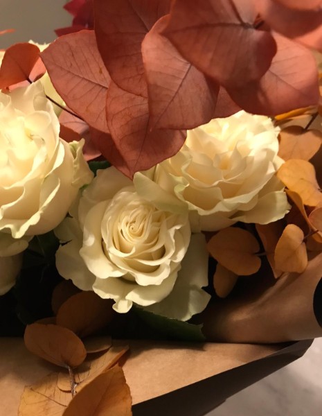 Bouquet Federica con rose bianche ed eucalipto stabilizzato dai toni bruciati