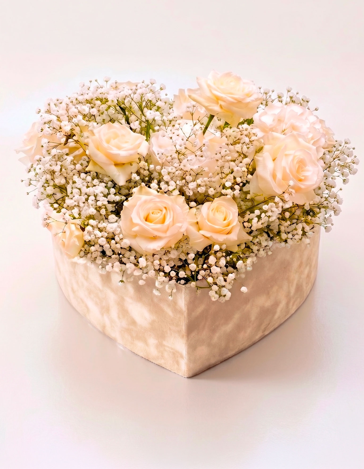 Romantica composizione floreale a forma di cuore con rose bianche, simbolo di eleganza e purezza. Perfetta per occasioni speciali come anniversari, matrimoni o regali raffinati.