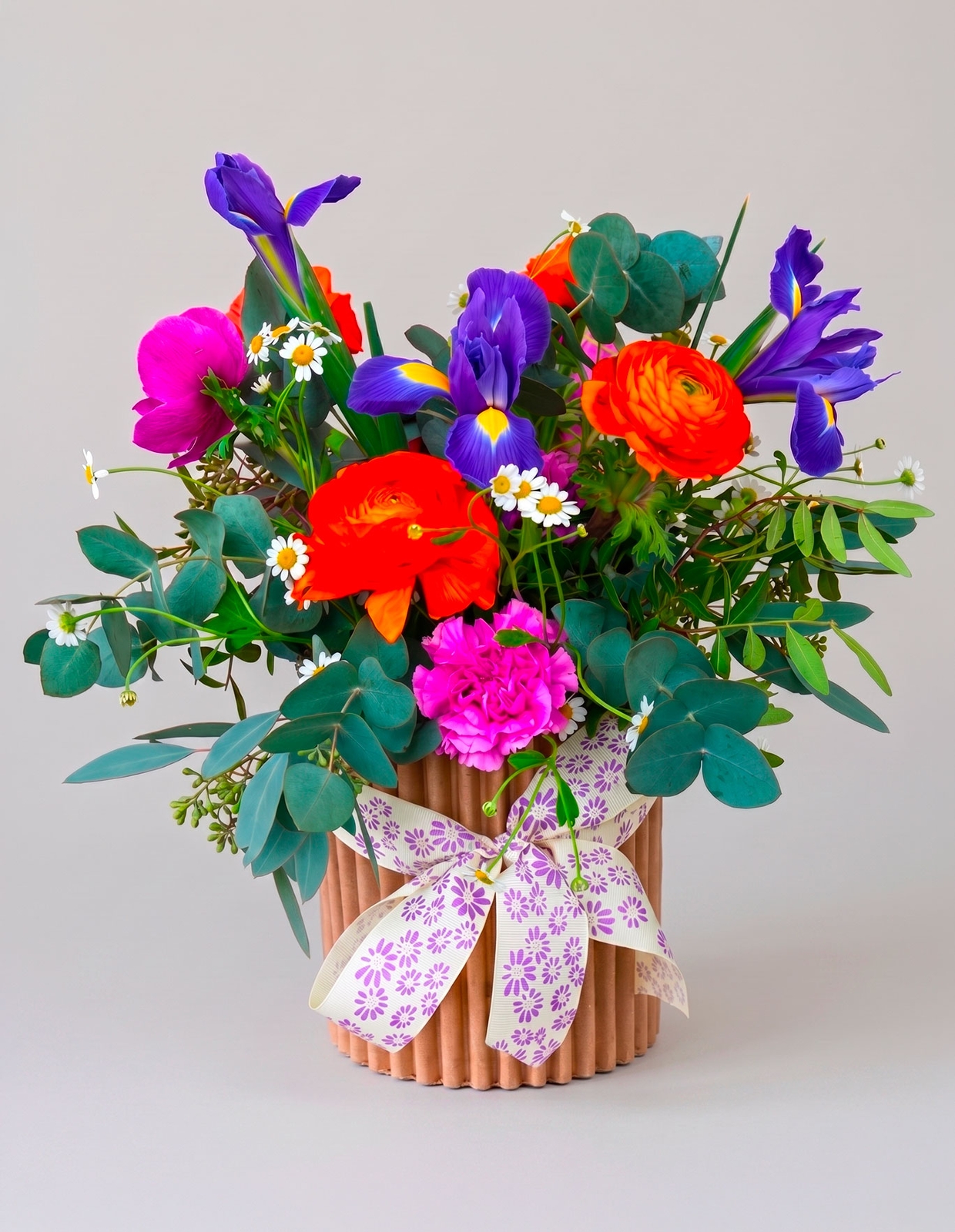 Elegante composizione floreale con iris e ranuncoli, dal fascino delicato e armonioso. Perfetta per un regalo raffinato o per decorare ambienti con un tocco di colore e naturale eleganza.