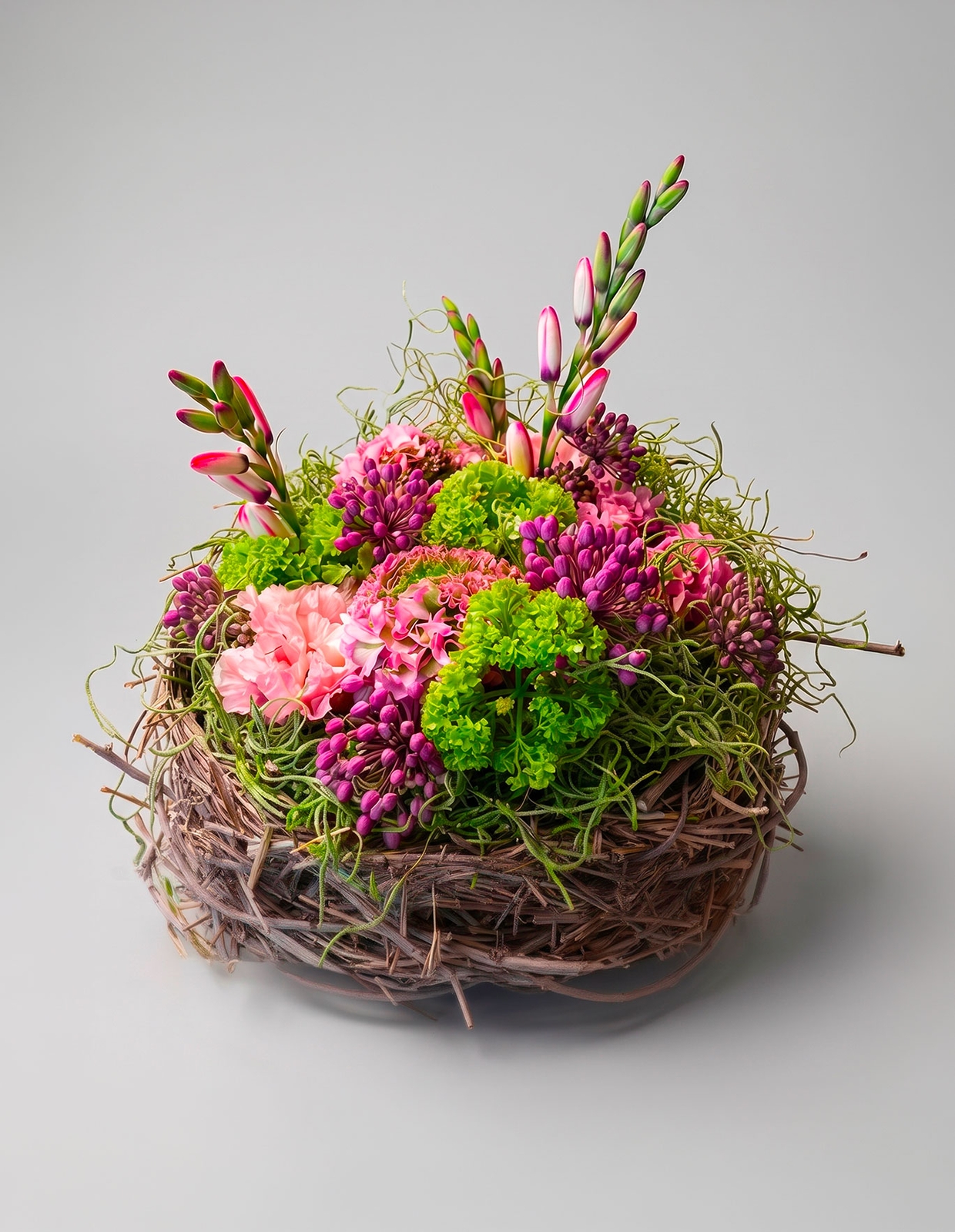 Delicata composizione floreale in stile “nido”, realizzata con fiori freschi di stagione intrecciati in modo armonioso e naturale. Un insieme morbido e avvolgente che richiama la forma di un piccolo nido, simbolo di cura, rinascita e dolcezza.