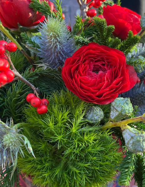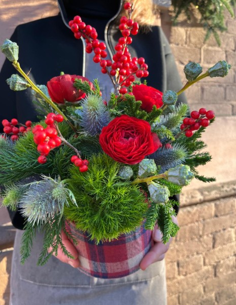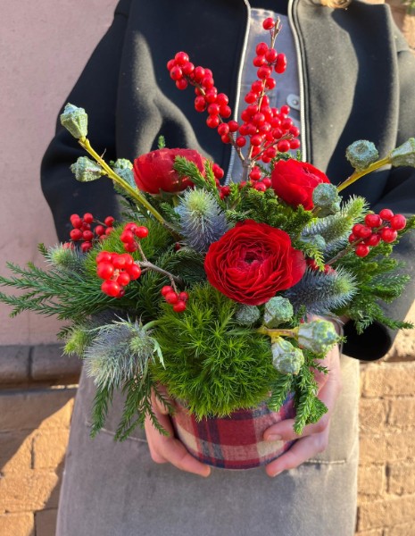 Elegante composizione floreale in stile scozzese con tonalità rosso e argento, arricchita da delicati riflessi azzurri. Una creazione originale e luminosa, perfetta per decorazioni stagionali e regali dal carattere distintivo.